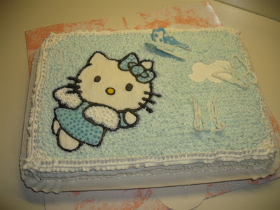 Hello Kitty e le farfalle le ho realizzate in ghiaccia,la torta è composta da pan di spagna al cioccolato,crema chantilly,bagna di latte zucchero e limone,ed è tutta ricoperta di panna.