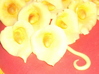 Ho preparato questa torta x il mio 10°anniversario di matrimonio.Ho fatto la base della torta con la classica Red Velvet un tipico impasto americano,il quale rimane molto umido e non ha bisogno di essere bagnato.Farcita con panna montata unita a Nutella,decorata interamente con pasta di zucchero,anche le calle sono state fatte a mano sempre con la pasta di zucchero. INGREDIENTI x la Red Velvet: g.300 di zucchero semolato , g.250 di farina , g.120 di burro a temperatura ambiente , g120 di yogurt bianco , g.120 di latte , 2 cucchiaini di cacao amaro in polvere , 2 uova , 1 cucchiaino di aceto bianco , 1 cucchiaino di bicarbonato , 1 cucchiaino di lievito x dolci , colore x alimenti rosso(io no).Io ho impastato prima tutti i liquidi insieme allo zucchero poi ho unito tutte le polveri ed ho infornato a 180° x circa 40 minuti(la cottura varia a seconda del propio forno non dimenticate la prova stuzzicadente).X la farcitura: g.300 di panna da montare(io senza zucchero) dopo averla montata ho unito 2 cucchiai di Nutella.X far aderire la pasta di zucchero alla torta ho preparato la crema di burro,gli ingredienti sono: g.500 di zucchero a velo , g.250 di burro a temperatura ambiente e 3 cucchiai di latte.Montare burro,vanillina e zucchero e in fine aggiungere il latte a filo.