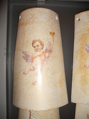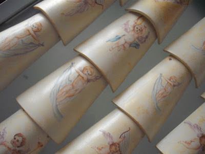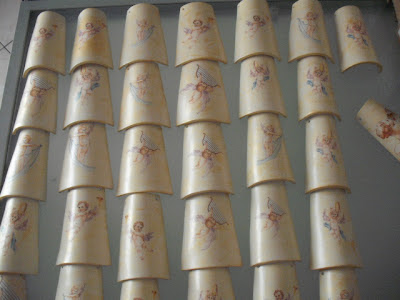Le tegoline misurano altezza 15cm. larghezza 8cm, tamponate con colore acrilico oro e i disegni rappresentanti dei piccoli angeli .