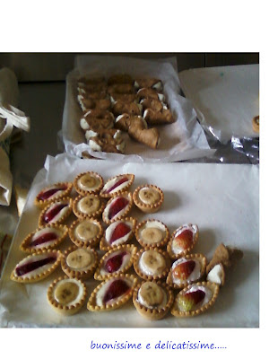 X i dolci avevo preperato cestini di frolla ripieni di crema e decorati con frutta; mini babba' al rum; tazzine di cioccolato al latte ripiene di panna e cioccolato a scaglie; mini cannoli siciliani; eeeeeeeee non ricordo altro.