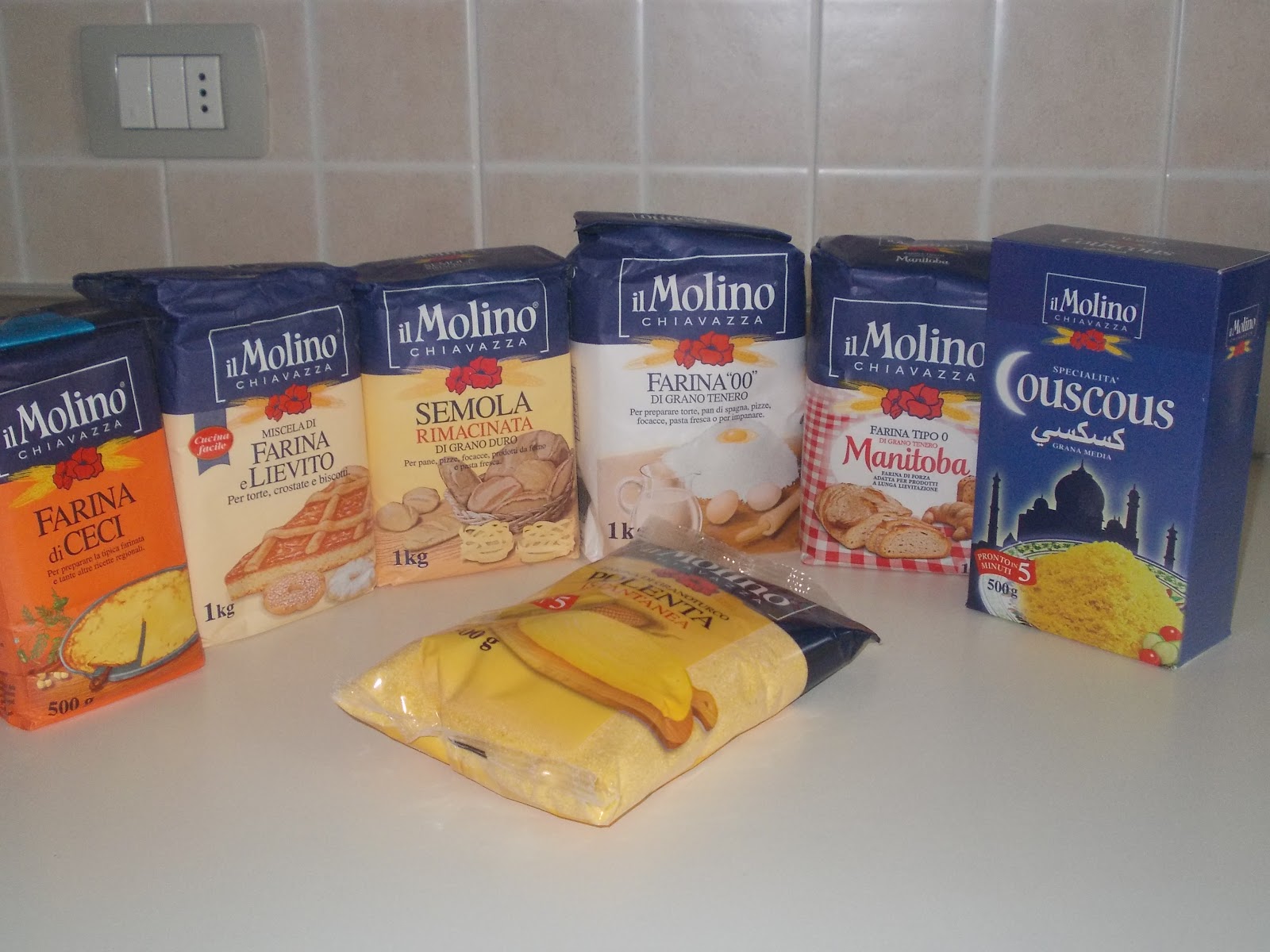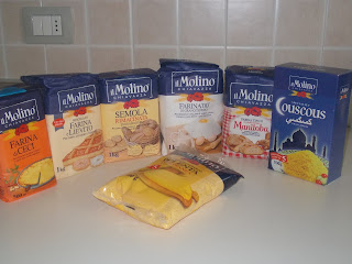Oggi è arrivato il corriere che mi ha consegnato un pacco,appena rientrata ho aperto il pacco e al suo interno ho trovato 1 kg di farina manitoba,1kg farina 00, 1 kg farina di semola di grano duro,1kg di farina e lievito,500g di farina di ceci,500g di farina di polenta e 500 g di cuscus tutto della MOLINO CHIAVAZZA....tutto al dir poco fantastico e non vedo l'ora di impastare ....